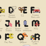 This ABC sampler features 26 motifs from the pop culture of the 1980s. TV, movies, fashion and technology.. everything that was super awesome in the decade of big hair and tight rolled jeans.